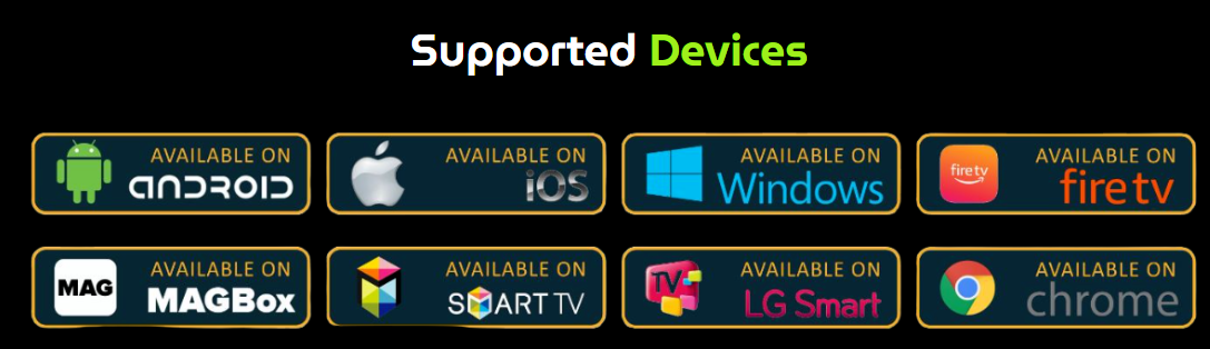 We support Smart TVs, Kodi, VLC, PCs, Vu+, DreamBoxes, Enigma, Android Boxes, Android Smartphones, and Max.